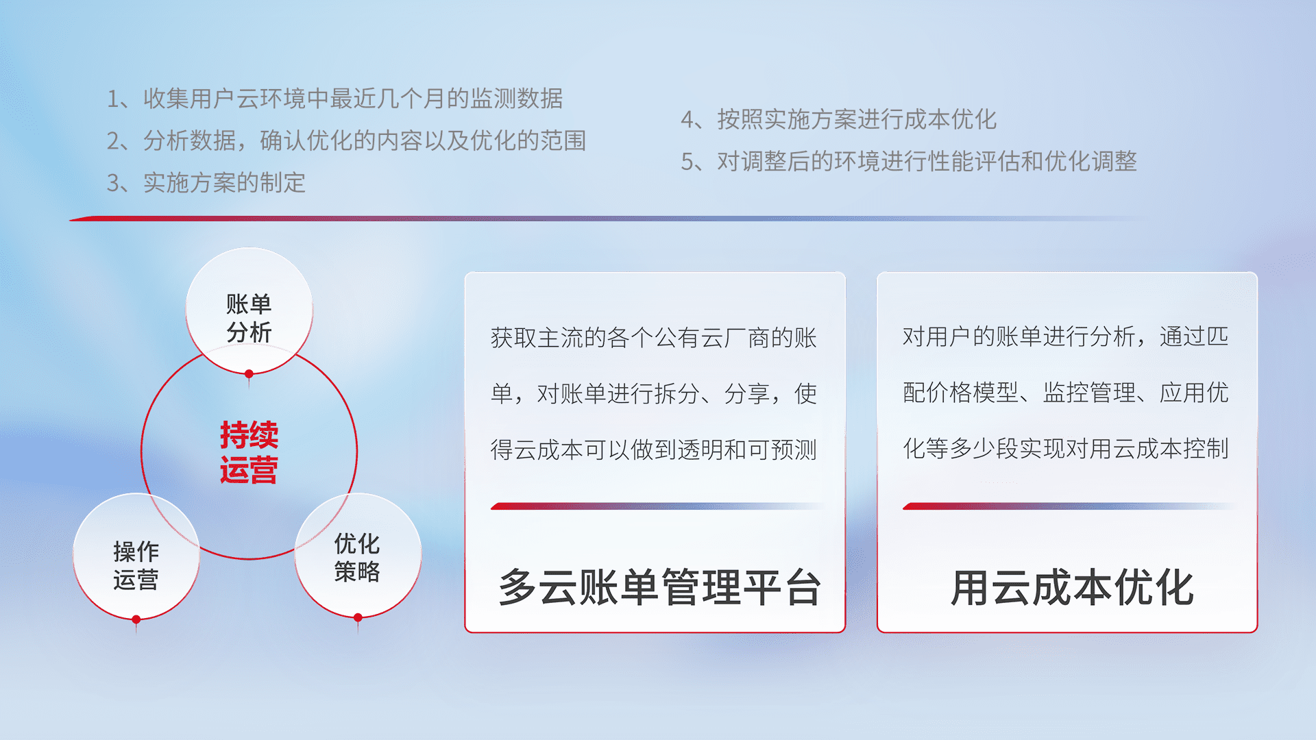通过多云纳管,,,以统一的资源数据模型把客户的云资源进行抽象和封装,,,进而实现对多云资源的统一操作,,,,保障云资源管理的可靠性、、、稳定性与可用性。。。。量身定制化运维内容,,,配置、、、、开发运维、、、、补丁管理、、、备份、、监控、、、、认证和访问管理、、、审计和日常巡检等,,保障在用云过程中的可靠度,,,,稳定度以及高可用率。。。